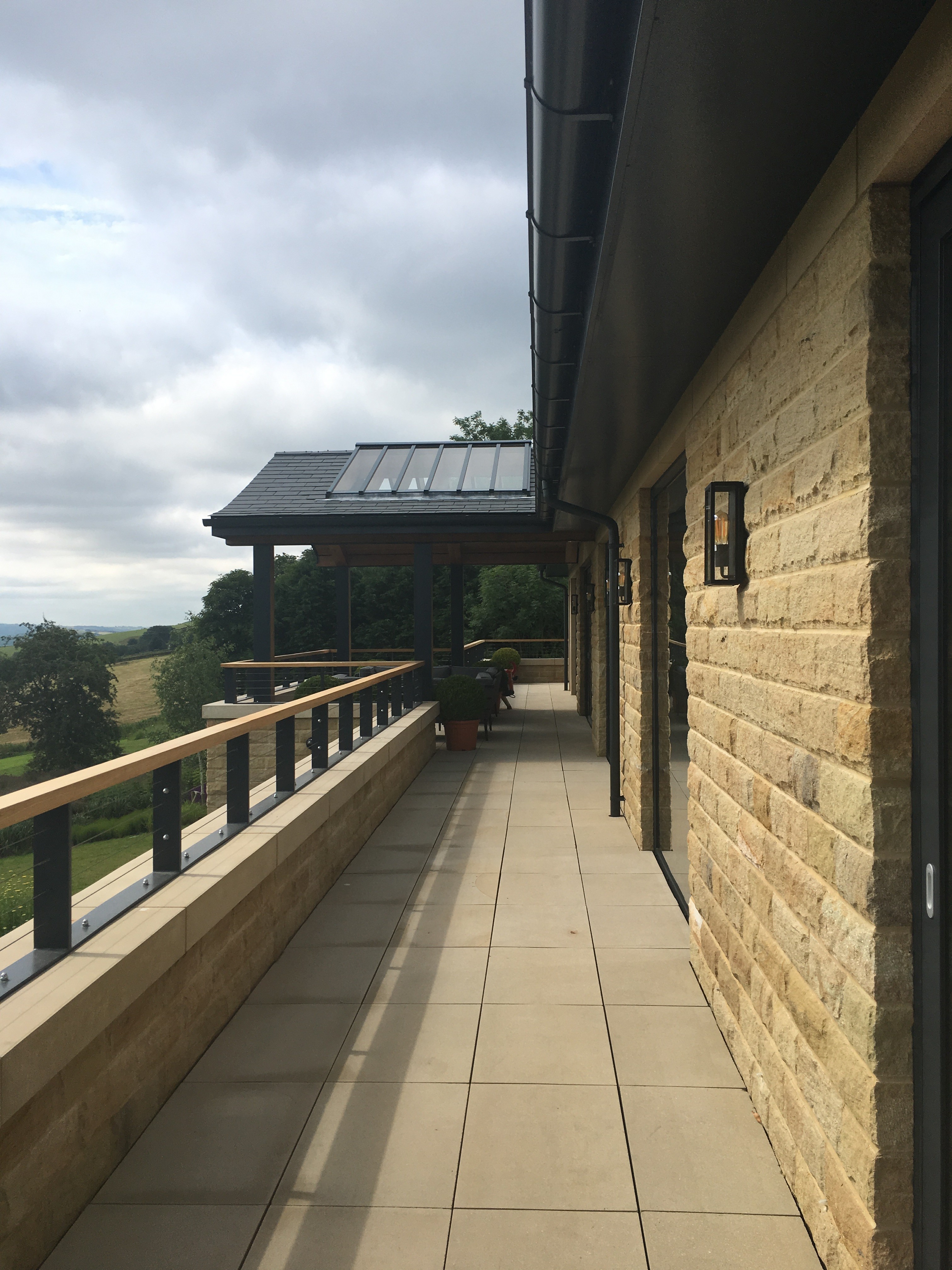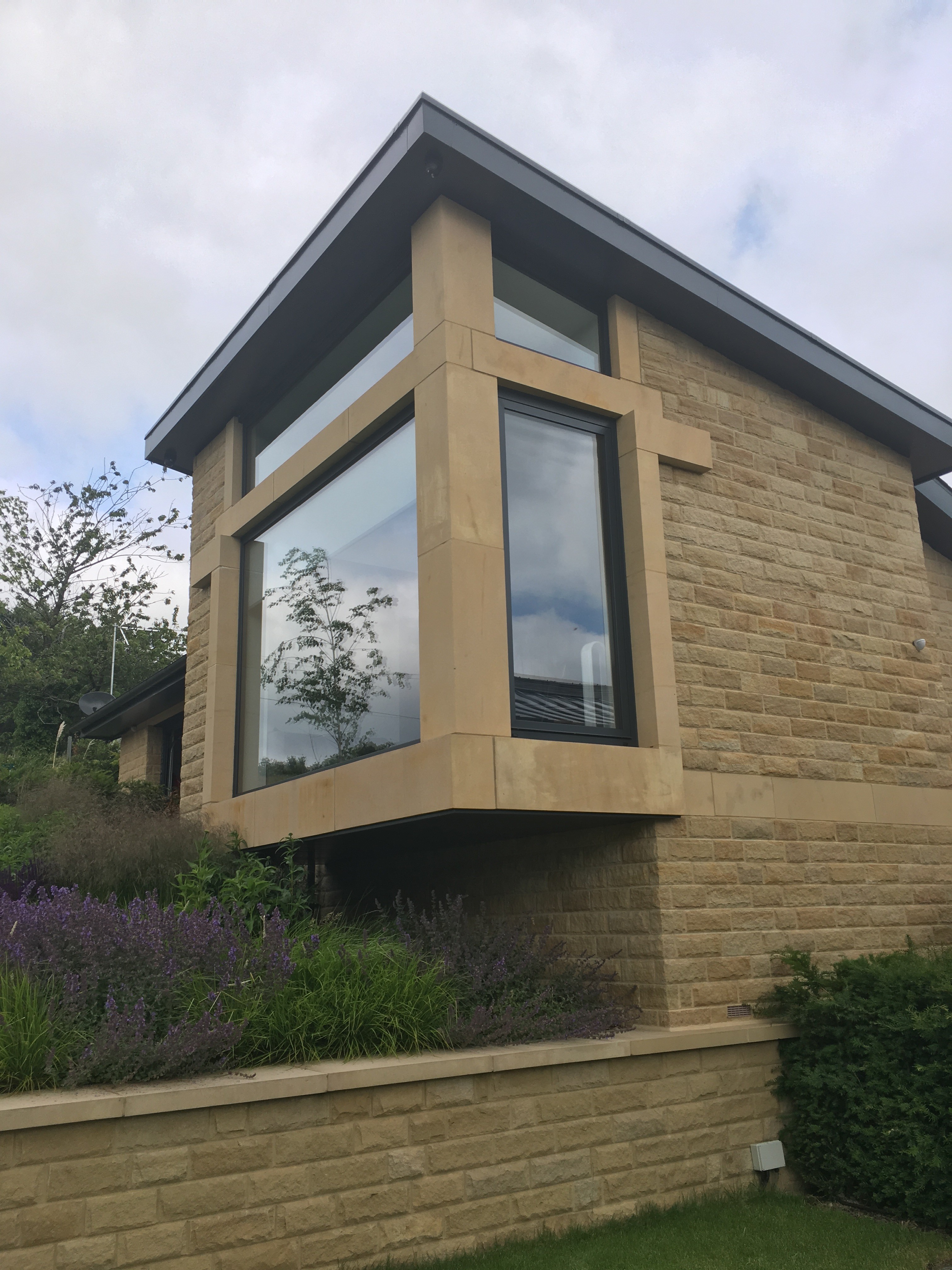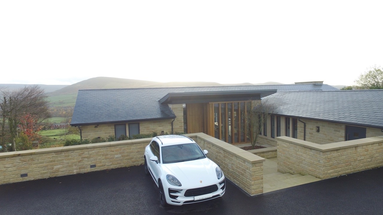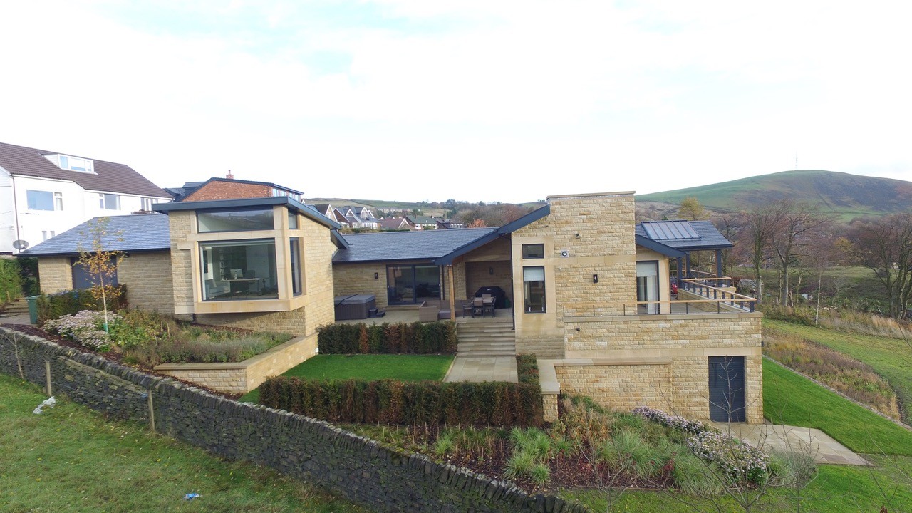 A contemporary property built into the hillside faced in natural stone and blue slate, with an innovative insulated concrete formwork (ICF) system forming the main structure to the lower level and a steel frame above.